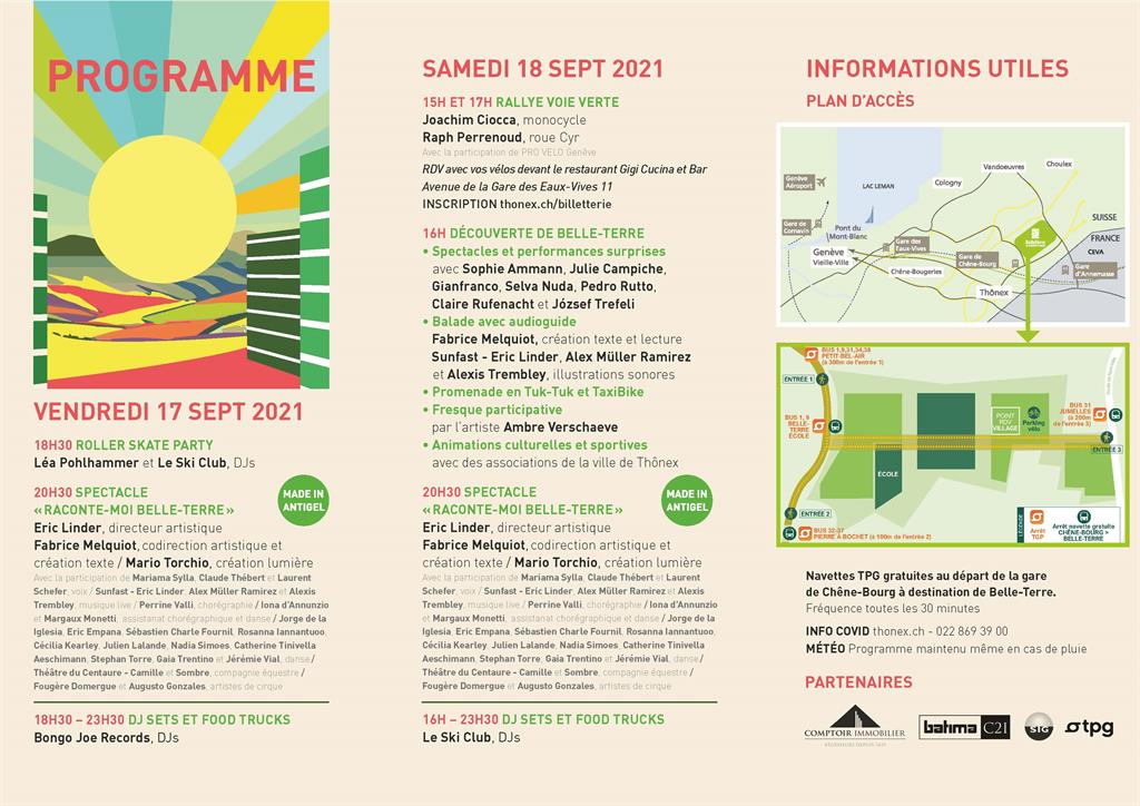 En partenariat avec la ville de Thônex, Antigel vous propose deux jours de fête dans le nouveau quartier Belle-Terre ! Au programme : un grand spectacle son et lumière qui aura lieu le vendredi 17 et le samedi 18 septembre prochains, ainsi que diverses animations et performances insolites qui se dérouleront tout au long de ces deux journées. Entre roller skate party, animations famille, food trucks et d’autres surprises encore, soyez les premiers à faire vivre Belle-Terre ! Entrée libre. Plus de détails à la rentrée !